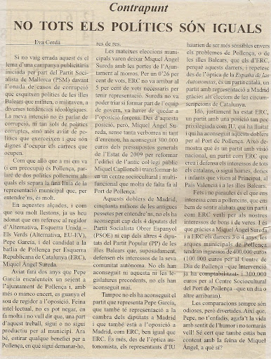 Diu també na Eva que “encalenteix un seient” i la meva feina és “verborrea i enrenou”, crec que o bé na Eva hauria de informar-se millor i venir més als plens a encalentir un seient o simplement hauria de ser més equànime a a les seves apreciacions. De moment hem presentat 38 mocions, de les que s'ha aprovat quinze, més de 300 precs i preguntes, al·legacions, hem penjat informació útil per a tothom al nostre blog urxella, hem descobert irregularitats com la de la neteja al Port... Aquesta activitat política , que sí que està en les nostres mans, amb el suport de l’equip de govern hagués estalviat una quantitat de doblers molt importat als pollencins. Però quan ets a l’oposició que les teves propostes s’arribin a fer depèn de l’equip de govern corresponent. Seria injust no reconèixer que els doblers que ens puguin arribar del pressupost de l’Estat són en part mèrit d’ERC però també del PSOE ja que és el partit que ha acceptat l’esmena als pressuposts.