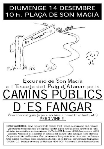 Esperem que el 2009 ens comenci a dur notícies positives en quan a la apertura de camins públics tancats al nostre municipi, com també esperem que el Consell Insular recuperi els trams actualment tancats de la Carretera Vella de lluc. Camins com Ternelles i Ariant han de ser accessibles als ciutadans, i un ús arbitrari d’aquests camins no fa més que justificar l’existència de la Plataforma pro Camins Públics i Oberts.
