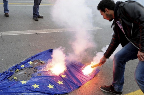 Un manifestant grec cremant una bandera de la Unió Europea.