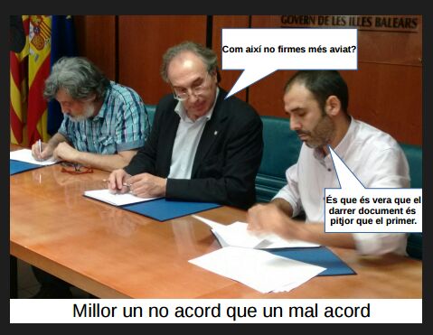Per altra part a les negociacions i a la signatura de l'acord ha estat evident el menyspreu de la Conselleria d'educació al comitè de vaga de l'Assemblea de Docents, cosa que no m'ha sorprès. El PSOE és pare del règim del 78 i fa anys que viu instal·lat en la mentida de ser alternativa a si mateix, sense canviar res més que les formes, el missatge o les cares... Ara toca parlar d'assembleista, de primàries, de transparència.... "Canviar-ho tot perquè no canviï res". Sí que em resulta més preocupant l'actitud del seu soci de govern, MÉS on crec que conviuen polítics amb actituds molt similars a les del PSOE amb persones que jo pensava que serien capaços de fer alguna cosa més que acomodar-se als esdeveniments i que ara el millor que podien fer és cremar les seves samarretes verdes. Van omplir els programes electorals de promeses, tothom s'escandalitza quan surten els resultats del fracàs escolar a les Balears o els diaris s'omplen amb titulars de l'informe PISA... Però a l'hora de la veritat els pressuposts d'educació no arriben ni a la meitat del 7% proposat per la UNESCO i és que en realitat l'educació els interessà un rave.