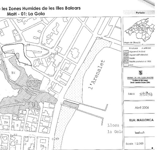Hem de recordar que fa més d'onze anys la Conselleria de Medi Ambient va elaborar un inventari de zones humides de les Illes Balears, cartografiant-les i descrivint els seus valors. Aquest inventari no té, per si sol, caràcter normatiu ja que era necessari aprovar un instrument legal que el complementi, un decret, i és el que es va intentar al primer pacte de progrés i s'està fent ara. Als documents preparatoris d'aquest que fa la Conselleria de Medi Ambient i que ha enviat a l'Ajuntament l'aparcament afecta directament a l'aiguamoll actual de la zona humida de la Gola (el podeu veure abaix). O sigui que els regidors que donen suport a aquest aparcament, han de tenir ben clar que aquest aparcament es pot fer legalment com s'ha plantejat, per que a l'anterior legislatura es va paralitzar el decret de zones humides i aquest encara s'està elaborant.