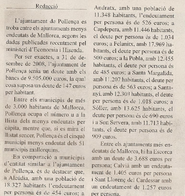 A més hem d'afegir que aquestes xifres fan referència només al deute amb els banc, d'aquesta manera no s'inclou el deute comercial amb empreses i particulars que al cas de Pollença és important.