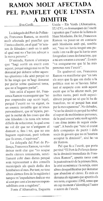 A l’article diu que “fonts d’Altenativa” apunten que l’autor de la recollida de firmes de petició de dimissió és Hans Monheim, quan seria més correcte dir que va ser el mateix Hans qui va fer un escrit que vam publicar al nostre blog Urxella ( com fem amb altres escrits de ciutadans que no formen part de la nostra assamblea) reconeixent que era un dels autors de la petició de dimissió.