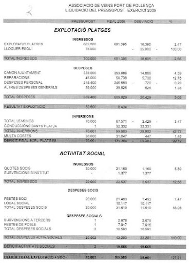 El format de presentació dels comptes de l’explotació de les platges per part de l’Associació de Veïns del Port de Pollença és poc professional i no dona una imatge fidedigna de la situació financera. Es troba a faltar principalment la situació de tresoreria, actiu circulant, així com el passiu, resumint falta el balanç de situació que ens donaria la situació real de l’Associació.