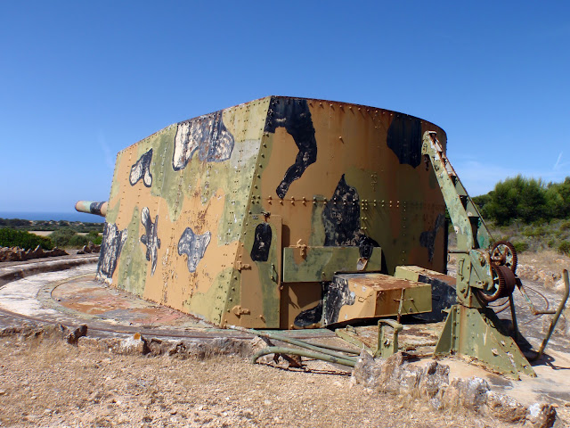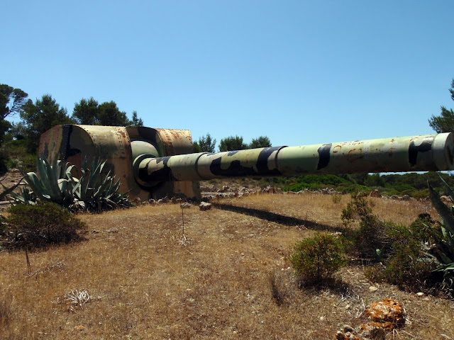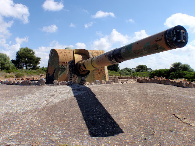 Ja l’havíem anomenada qualque vegada però el que me va cridar l’atenció és que de la carretera se veu un dels canons i no m’hi havia fixat, en realitat n’hi ha dos. Se tracta de canons Armstrong Vickers 305, a Refeubeix també hi havia aquest tipus de canó i eren els més potents que s’instal·laren a Mallorca, cada unitat pesava unes 66 tones.