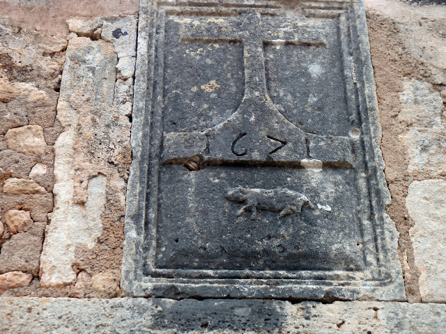 Passant a un altre tema, veureu una foto d’un escut que està a la paret d’un aljub prop del salobrar, té la data de 1671 però el curiós és que l’animalet que hi ha no és un ós, com a l’escut actual de Campos, sinó un porc. No sé quan s’inventaren el de l’ós però no crec que sigui molt antic.