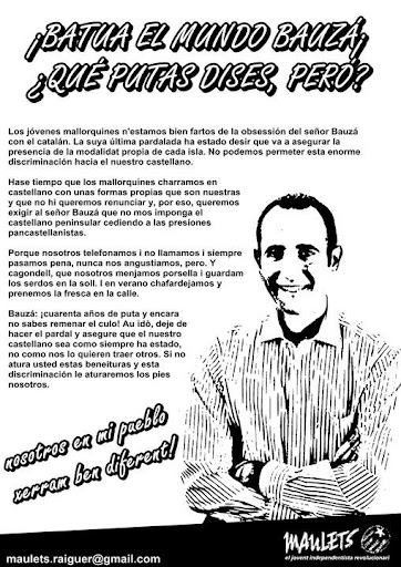 Això pens quan sent a dir que la colla d’estrúmbols etnocides Bauzà, Delgado, Campos i Rodríguez, ara acompanyats de l’escabotell de UPyD, volen regir els destins del nostre petit país. Fa cents d’anys que ens volen anorrear i molts de mallorquins fent la farina blana, ja han tirat les rendes damunt el coll; han aprés el llenguatge de l’amo i ja no saben qui són. ¿Seràs tu un d’aquests?