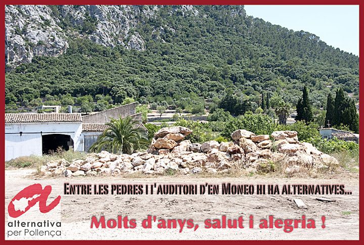 Com hem dit, ENTRE LES PEDRES, inamovibles i que no serveixen per res més que per dificultar l'aparcament, I L'AUDITORI DE MONEO, que ens hipotecarà el futur endeutant-nos per molts d'anys... HI HA ALTERNATIVES: una gestió transparent, amb seny, amb molta il·lusió, dedicació i ganes. Una gestió que pensi en el futur de tots els pollencins més que en obres faraòniques.