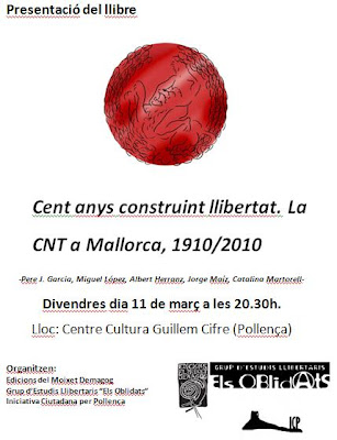 Des d'Iniciativa Ciutadana per Pollença ens han demanat donar la màxima difusió a aquest acte que trobam molt interessant. La història dels moviments socials més compromesos i combatius sempre ha estat molt arraconada. De la CNT a Mallorca se n'han dit ben poques de coses, i la més repetida és que gairebé no eren ningú. Però sempre hi ha excepcions. Sempre hi ha gent que no es ressigna i que s'endinsa dins aquests temes i aconsegueix posar llum a una part de la història que, segons ens conten, va ser molt major del que ens han contat. Perquè conèixer la nostra història ens permet seguir caminant cap al futur i perquè, com diu Raimon, qui perd els orígens, perd la identitat, us recomanam que assistiu a la presentació d'aquest llibre, el llegiu i sereu més lliures.